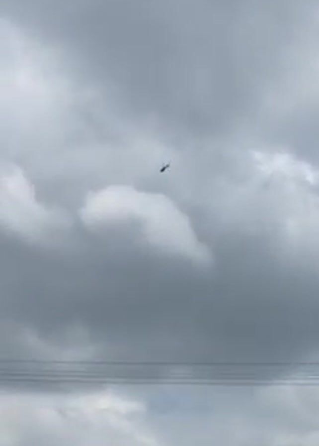 Here's a detailed description of the video: The video shows a distant helicopter flying against a cloudy sky. The helicopter appears as a dark silhouette against the backdrop of white and grey clouds. There are power lines visible in the foreground, spanning horizontally across the frame. Below, the tops of trees can be seen, adding a touch of greenery to the scene. The overall atmosphere is somewhat overcast due to the heavy cloud cover.