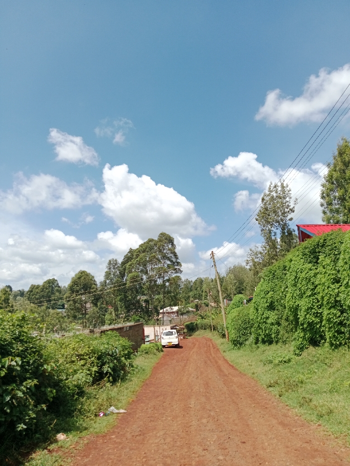- "The image depicts an unpaved, reddish-brown dirt road ascending through a semi-urban or rural area in Nyeri, Kenya, under a clear blue sky with scattered white cumulus clouds" by FM-U47GF3, licensed under CC BY 4.0
