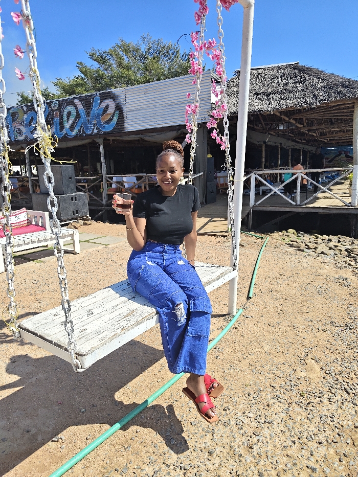 A female subject is positioned centrally, seated on a white wooden swing bench. She wears a black short-sleeved top, blue distressed wide-leg jeans, and red open-toed sandals. Her hair is styled in a bun. She holds a clear glass containing a dark liquid in her right hand and smiles towards the camera. The swing's white metal frame is adorned with pink artificial flowers. The ground beneath is sandy-gravelly, with a green hosepipe extending across the lower foreground. In the background, a building with a corrugated metal exterior displays "Believe" in multi-colored graffiti. To the right, a separate thatched-roof structure, appearing to be an elevated deck or restaurant, extends over a body of water, supported by white stilts and bordered by white wooden railings. This setting is identified as Dunga Hill Camp, situated on the shores of Lake Victoria in Kisumu, Kenya. The sky is clear blue.