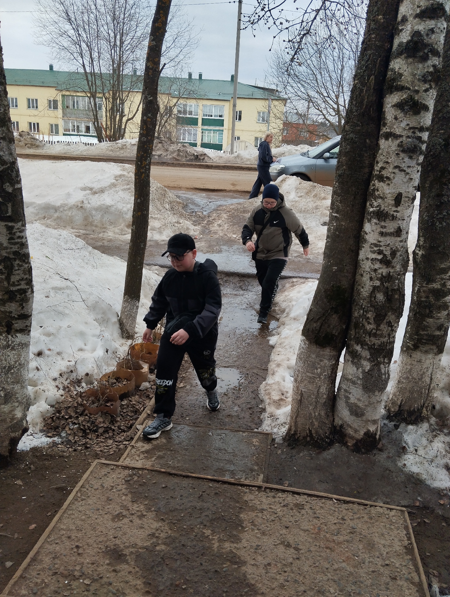 The image depicts an outdoor urban scene in Krasnogorskoye, Russia, characterized by melting snow and muddy ground under an overcast sky, suggesting late winter or early spring. In the foreground, a muddy path consists partially of two dark grey concrete slabs. To the left of the path, several cylindrical, rust-colored containers, possibly planters, are filled with dry leaves and debris. To the right, three tall, bare deciduous trees with dark and light bark textures, possibly birches, stand upright. A single bare tree with dark bark is also visible on the far left. Two young males are walking on the muddy path towards the viewer. The subject in the left foreground wears a black baseball cap, glasses, a black and grey hooded jacket, and black sweatpants with "FREEDOM" text and designs on the left leg, paired with dark athletic shoes. The second subject, positioned slightly behind and to the right, wears a dark blue beanie, glasses, a khaki and dark grey jacket with a white Nike logo, and black athletic pants with white side stripes, also wearing dark athletic shoes. Further back, large, dirty snowdrifts line an unpaved or dirt road. A silver sedan is parked on the right side of this road, partially obscured by snow and trees. Behind the vehicle and to the left, an adult female with blonde hair, dressed in a dark hooded tracksuit, walks away from the viewer. A fourth individual, an adult male in dark clothing, is partially visible walking further down the road in the background. The background features a multi-story residential building with a light yellow facade and a green roof, exhibiting multiple windows. Bare trees and a utility pole are visible throughout the mid-ground and background. The ground is largely saturated with water and mud, with patches of residual snow.