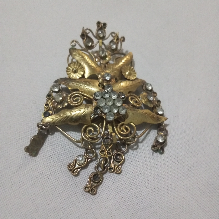 An antique brooch features a floral design with golden leaves and swirling, ornate metalwork