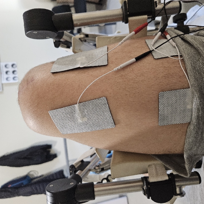 The image depicts a human upper thigh and lower hip region in a clinical or rehabilitation setting, city of Unknown, Unknown
