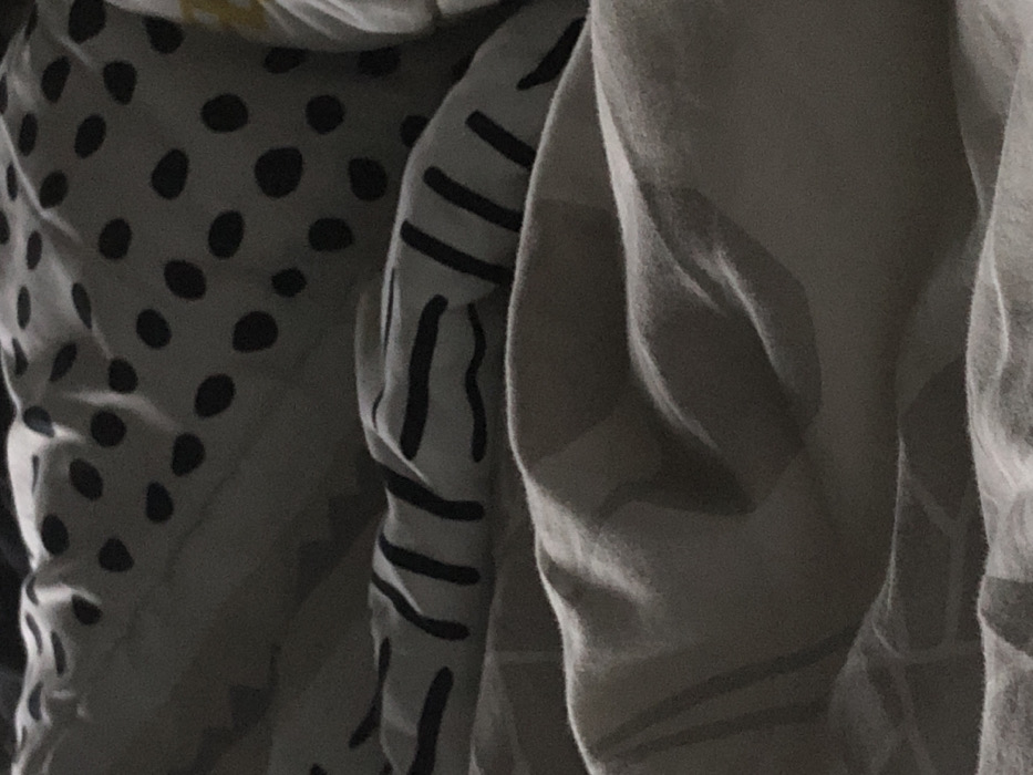 A close-up depicts several fabric layers. The leftmost fabric has a polka-dot pattern. Adjacent to it is a fabric with a pattern of short, thick, vertical lines. The fabric furthest to the right is a light grey or beige with a subtle, possibly striped, pattern. The fabric is bunched and folded, creating depth and shadows. Lighting is somewhat dim, giving the image a muted tone.