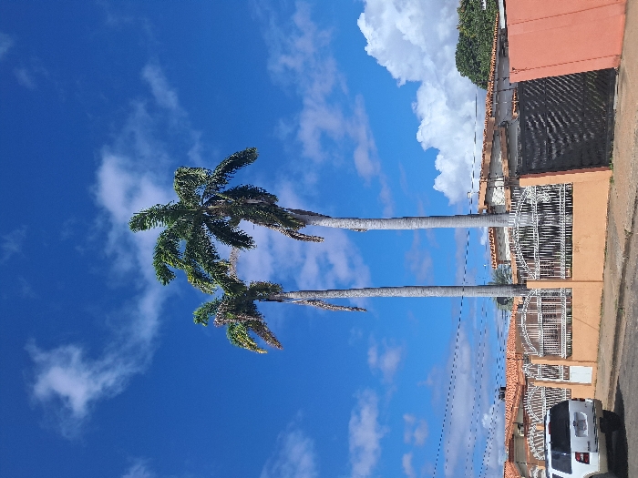 Two palm trees dominate the scene, their slender trunks reaching skyward into a vibrant blue sky dotted with puffy white clouds. Adjacent to the trees stands a peach-colored building with an intricate white metal fence. A white van is parked near the building's entrance, and power lines stretch across the sky. The composition is horizontally oriented, lending a sense of openness to the landscape.