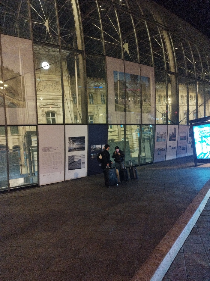 Two people stand with four pieces of luggage against a backdrop of large glass panels displaying images and text. The glass reflects a building across the street. The scene is illuminated by streetlights and signage, creating a contrast between light and shadow. The ground is a dark pavement, and a curb is visible on the right side of the image. The atmosphere suggests an urban setting, possibly a train station or transit hub.
