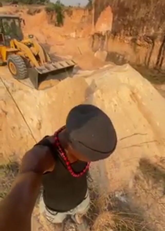 A man in a black tank top, a black do-rag, and a red bead necklace is standing in a sand quarry, holding a phone up for a selfie-style video. Behind him, a yellow front loader is driving along a pile of sand. The quarry appears to be a large pit in an area of red soil. There is a tree visible in the background. The sun is shining.