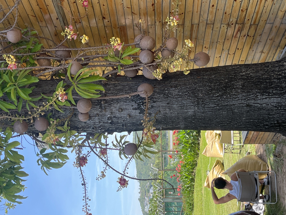 The image depicts an outdoor scene in บ้านบางรักษ์, Thailand, under clear daylight conditions. A large Cannonball tree (Couroupita guianensis) occupies the central and right portions of the frame, showcasing a dark, textured trunk from which numerous spherical, brown fruits and clusters of pink and yellow flowers emerge directly. The tree's green leaves are visible against a bright blue sky. To the left of the tree, a manicured green lawn extends towards the background. On this lawn, a single individual is seated in a light-colored folding chair, positioned with their back to the viewer. This person wears a white tank top and dark attire, with their right arm raised and hand placed behind their head. Two large, yellowish-gold bean bag chairs are visible on the grass near the seated person, along with a small, light-colored table. Beyond the lawn, a green chain-link fence runs horizontally. Behind the fence, a bed of red-flowering plants (likely Canna lilies) is prominent, followed by a flat, grey paved surface, indicative of an airstrip or runway. Distant hills with scattered white buildings are visible under the clear sky. To the immediate right of the tree, a vertical light brown wooden-slatted wall forms the background. The scene is well-lit, suggesting a sunny day.