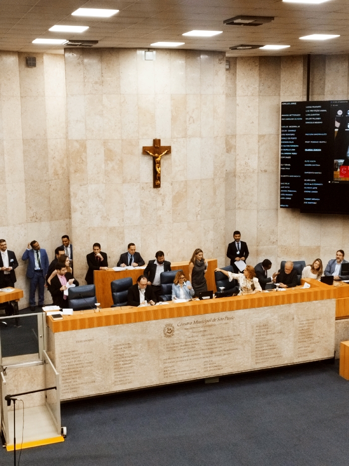 Inside what appears to be a government building, a group of formally dressed individuals are seated at desks, possibly in a courtroom or council chamber. A large screen displaying text is visible on the wall to the right. A wooden cross is mounted above the group. The room has a high ceiling and is decorated with light-colored marble walls. A wheelchair lift is in the foreground.
