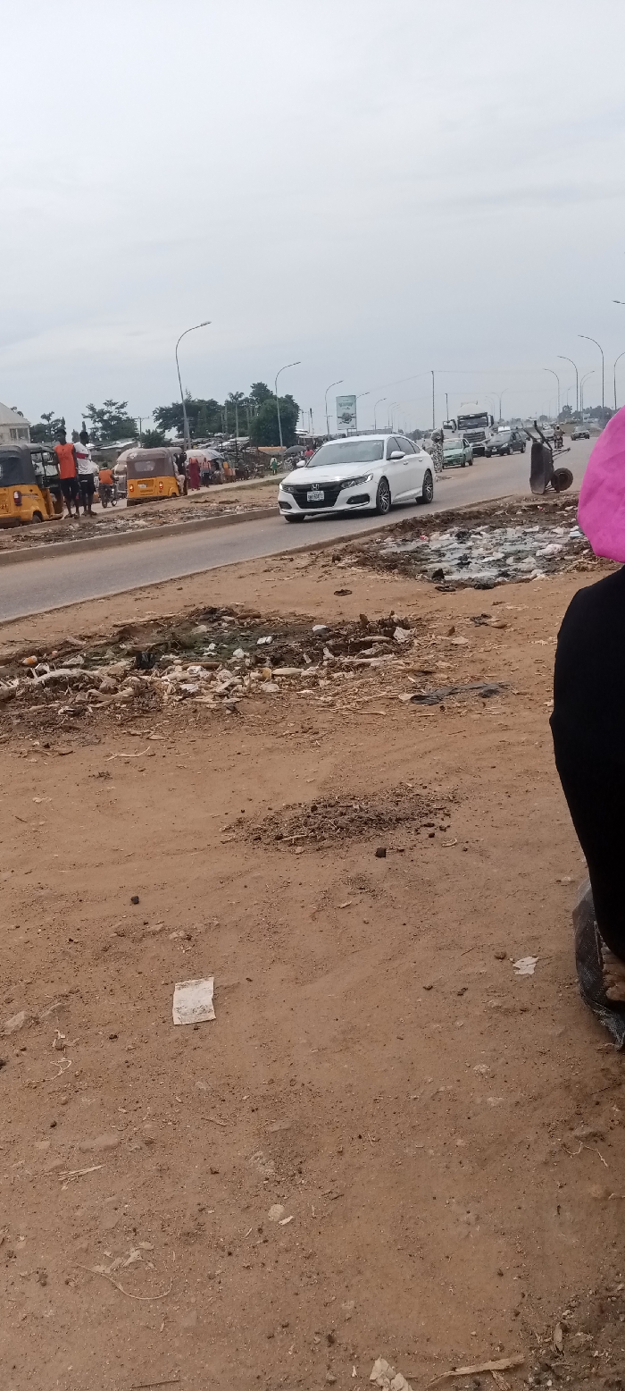 The image depicts a roadside scene in the city of Sabojibi, Nigeria, under an overcast sky. The foreground features a wide expanse of disturbed reddish-brown dirt, heavily strewn with scattered litter, including plastic debris, paper, and general refuse, forming small mounds and muddy patches. A piece of white paper is visible on the ground directly in front of the viewer. To the immediate right, the back and right shoulder of an individual wearing a black garment and a vibrant pink head covering are partially visible, indicating the viewer's perspective is from slightly behind and to the side of this person. A two-lane asphalt road, divided by a raised dirt median also littered with refuse, runs diagonally through the mid-ground from left to right. A white Honda Accord sedan, with license plate "NNN-604TI," is in motion on the right lane, heading away from the viewer. Further down the road, other vehicles including a green car, a large white truck, and additional cars are visible in traffic. On the left side of the road, near the median, several yellow auto-rickshaws (Keke Napep) are present. A group of individuals, some wearing orange shirts, are standing or moving beside these auto-rickshaws. Beyond the road and median, in the background, more people are visible along a bustling roadside area, suggesting market activity or a gathering. Multiple streetlights with curved poles extend into the distance along both sides of the road. Sparse green foliage from trees and bushes is visible on the left side, behind the groups of people and vehicles. A black wheelbarrow is positioned on the right shoulder of the road, behind the white sedan.