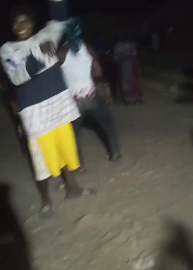The video depicts an outdoor gathering at night. Several individuals are visible, some of whom are dancing to music. One person is wearing a white tank top and jeans, with a headscarf. Another person is wearing a white and blue top with yellow shorts. The background is dark, with some indication of uneven ground. There's a shadow of the camera-person visible in the foreground. The overall scene seems to be an informal social event.