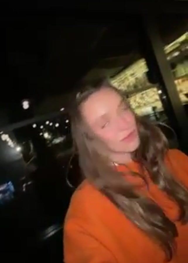 A woman with long brown hair, wearing an orange sweatshirt, smiles at the camera. She is in a dark environment, possibly a bar or club, with a DJ console visible in the foreground. She is likely a DJ or a performer at the venue. The background is dimly lit, showing glimpses of other patrons and ambient lighting.