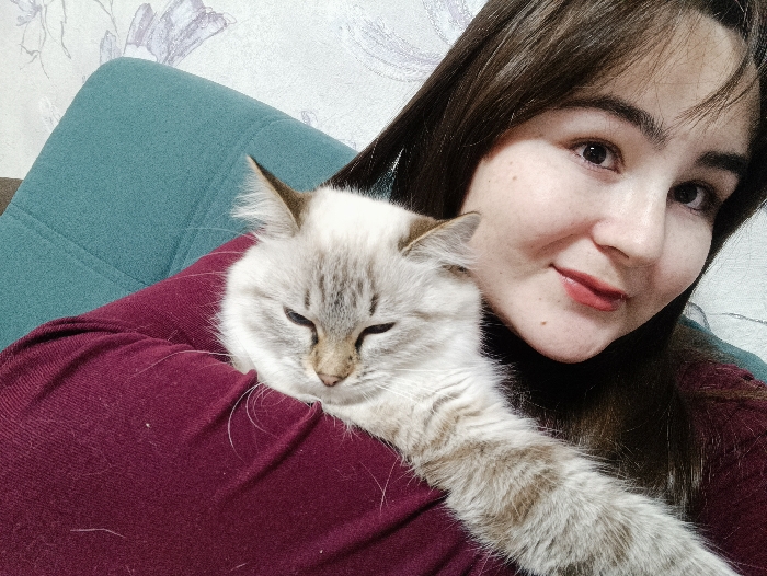 An indoor scene in Noviy, Russia, depicts an adult female holding a domestic cat. The female, with brown hair and light skin, looks towards the camera with a slight smile. She is wearing a dark red long-sleeved garment, which has visible light-colored cat hairs on it. Her left arm is partially visible, supporting the cat. The cat, exhibiting light-colored fur with darker points on its face and ears, is resting on the female's chest with its eyes closed. In the background, a teal-colored upholstered surface is partially visible behind the female and cat, against a light-colored wall featuring a subtle patterned wallpaper.