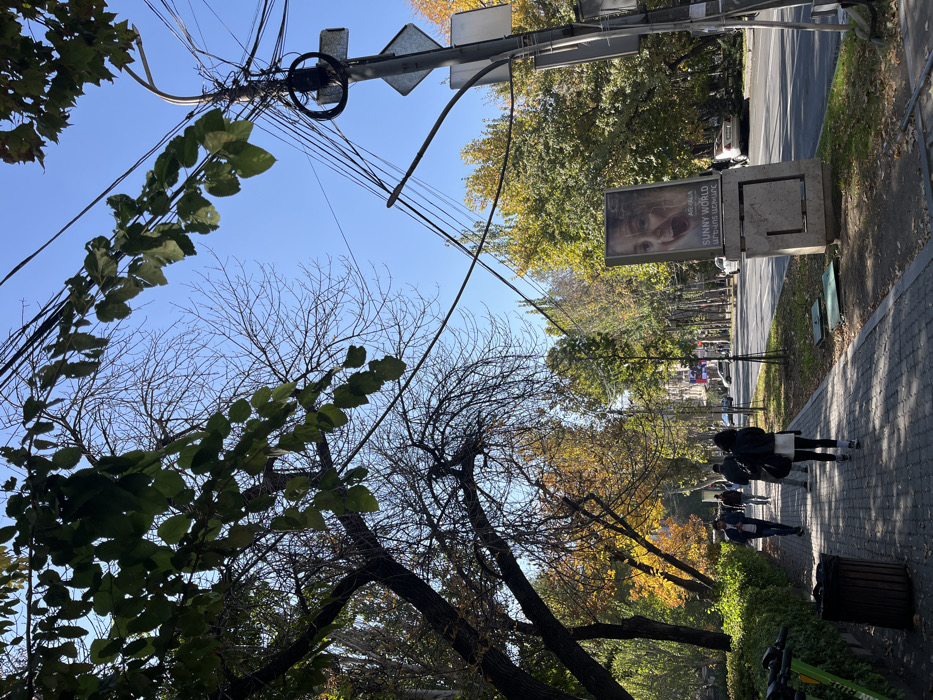 The image displays a daytime, outdoor street scene on a tree-lined urban boulevard in Yerevan, Armenia, under a clear blue sky. The season is autumn, evidenced by a mix of green, yellow, and orange foliage on the numerous trees. In the foreground on the left, a paved sidewalk with grey cobblestone-like tiles is visible. Several green electric scooters are partially visible on the far left edge. A dark, cylindrical waste receptacle stands on the sidewalk. A group of five pedestrians walks away from the viewer; the most prominent is a female wearing a black jacket, white leggings, and dark shoes, with a light-colored shoulder bag. Adjacent to the sidewalk, a grassy strip contains smaller trees. On this strip, a vertical billboard presents an image of a child's open-mouthed face, with the English text "AKLAD SUNNY WORLD" and accompanying Armenian script, set upon a grey concrete base. Beyond the grass strip lies a multi-lane asphalt road with distant vehicles. The upper right portion of the frame features a utility pole supporting a dense network of black electrical and communication wires that crisscross against the sky. A streetlamp arm extends from this pole. Tall trees, displaying various autumnal colors, line both sides of the street, partially obscuring multi-story urban buildings in the background. The upper left corner is partially obscured by a cluster of dark green leaves from an overhanging tree branch.