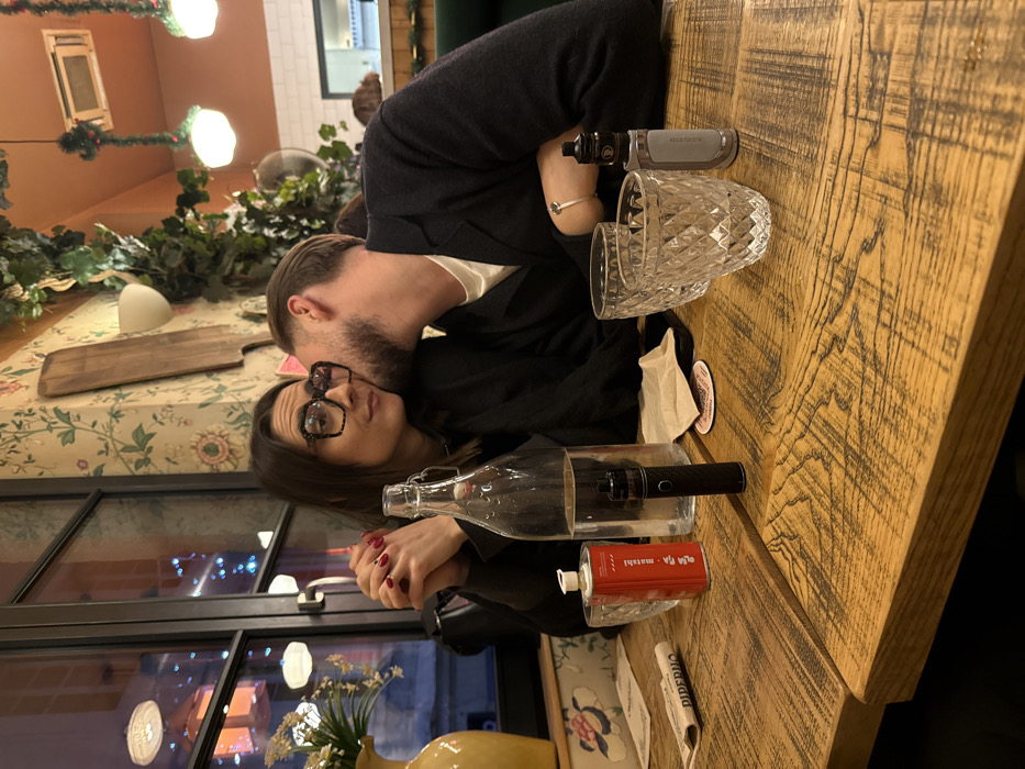 A man nuzzles a woman wearing glasses at a restaurant table. A glass bottle, a red "ga - matshi" can, a black device, and a newspaper sit on the table, along with an empty patterned glass and an electronic cigarette. Christmas decorations hang in the background, and a window with reflected lights is visible. The interior is decorated with floral wallpaper and artificial greenery.