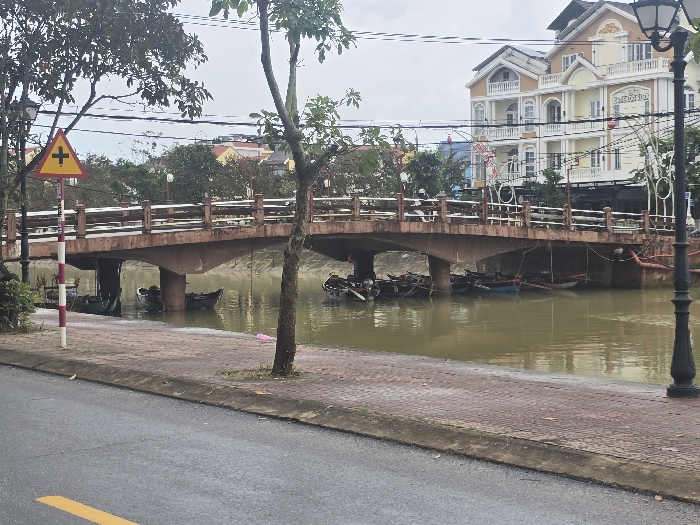 A brown arched bridge spans a murky river where several small boats are docked underneath