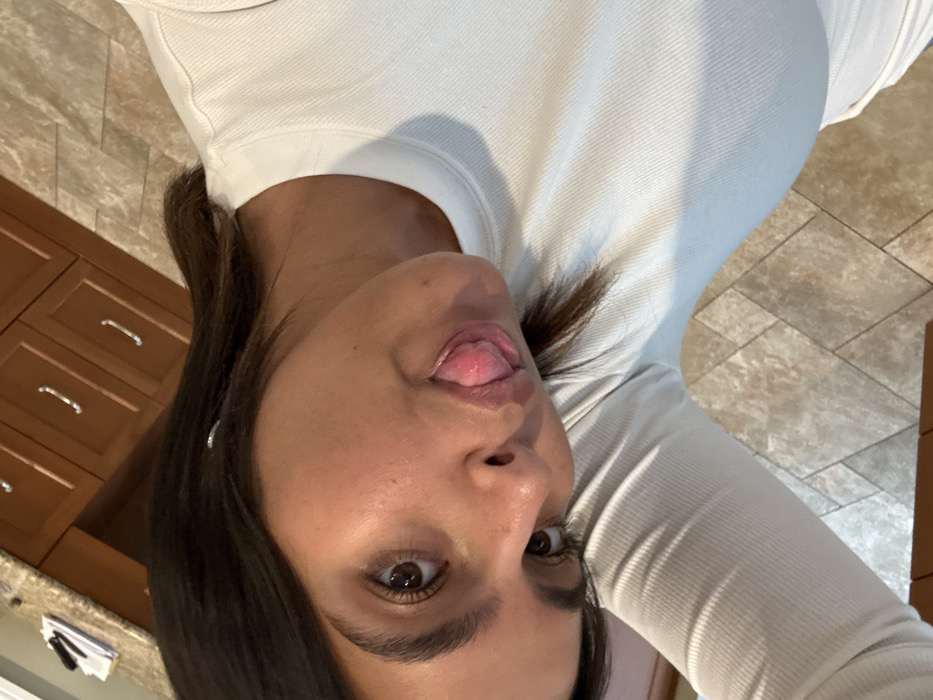 The image displays a female individual, approximate age young adult to middle-aged, with dark brown hair and a medium complexion, wearing a cream-colored, long-sleeved, ribbed top. Her head is tilted to the viewer's right, and she is looking directly at the camera with her tongue extended from her mouth in a playful gesture. The background is an indoor residential setting, likely a kitchen or dining area. Visible elements include a light-colored countertop with papers and a dark-handled utensil on the upper left, brown wooden cabinetry with silver handles in the mid-left, and beige-toned tiled flooring laid in a diagonal pattern in the lower right. There are no visual identifiers within the image to confirm its specific location in the city of Princeton, United States.