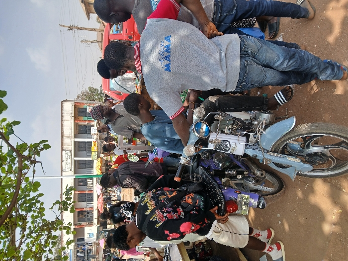 This image depicts a bustling outdoor market scene in Heany, Zimbabwe, under bright daylight with a clear to hazy sky. The ground consists of unpaved, reddish-brown dirt. A tree branch with green leaves partially extends into the top left of the frame. Central to the foreground are two motorcycles: one light blue/grey with chrome handlebars and a silver front wheel, and a second purple/dark blue model with a black seat and silver rear wheel. Several individuals are clustered around these vehicles. A male figure wearing a grey t-shirt with "Adieu MAMA" in blue text on the back, blue jeans, and brown shoes stands with his back to the viewer, facing the light blue motorcycle. To his left, another male figure wearing dark pants and black-and-white striped slides is positioned on or leaning against the light blue motorcycle. On the far left, a person in a black long-sleeved shirt with colorful patterns, white shorts, and white-and-red striped socks with white slides is crouched near the purple motorcycle, appearing to interact with it. The midground features a crowd of approximately 15-20 individuals, predominantly male, dressed in casual clothing including t-shirts, shirts, and a patterned headwrap. They are engaged in general movement and observation, typical of a market setting. Several temporary market stalls or display tables with visible merchandise are interspersed throughout the crowd. A partial view of a red pickup truck is visible on the far right. The background is dominated by a two-story commercial building with a light-colored facade, dark-framed windows, and a series of arched openings or balconies on the upper floor. A tall, slender pole with green and white stripes stands prominently in front of this building. Utility poles and overhead wires are visible against the sky, defining the urban environment.