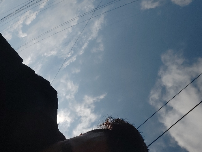 The image displays an upward-angled view of a sky scene, situated within the city of Gimpo-si, South Korea. The upper two-thirds of the frame show a clear blue sky with scattered white, wispy cumulus clouds. Several dark, thin utility lines traverse the left and upper sections of the image diagonally. The lower right quadrant is occupied by the partial, heavily silhouetted profile of an individual, photographed from a low perspective. Details visible include the top of a head with dark hair, which exhibits a bright, luminous outline caused by a strong light source, likely the sun, positioned directly behind the person. A small, indistinct portion of the individual's right ear and the side of their face are discernible in shadow, above a dark, formless mass that represents the upper body or clothing. No specific actions or interactions are evident.