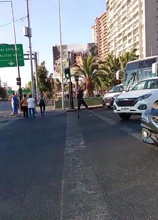 city street scene on a sunny day. Several people are seen walking on the sidewalk. A man in a black shirt and shorts is walking across the street in the crosswalk. Cars and a bus are stopped in traffic, waiting for the light. Tall buildings and palm trees are visible in the background. Streetlights and signs are also present.