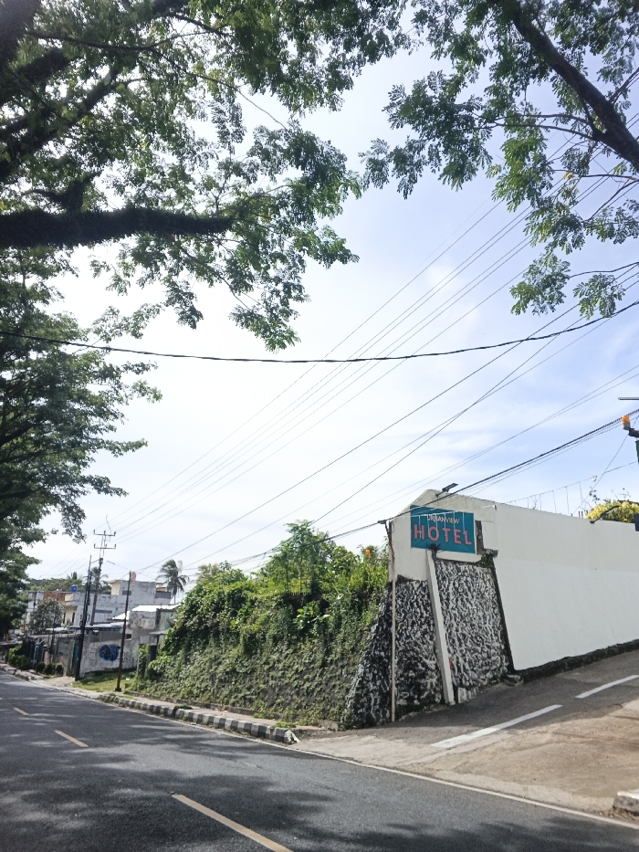 A street scene under a canopy of green trees. Electrical wires crisscross the sky. On the right, a white wall with a sign reading "Urbanview Hotel" sits atop a sloped, mossy base. A road runs along the bottom of the frame, with adjacent sidewalks defined by gray and white curbs. Buildings are visible in the background beyond a green-covered slope.