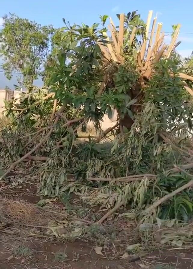 tree that has recently been heavily pruned. The tree's trunk and main branches remain, but most of the smaller branches and leaves have been cut off and are lying on the ground around the tree. The sky is blue with a few white clouds. A house or building can be seen in the background. There is no one visible in the video. The camera pans slowly from left to right.