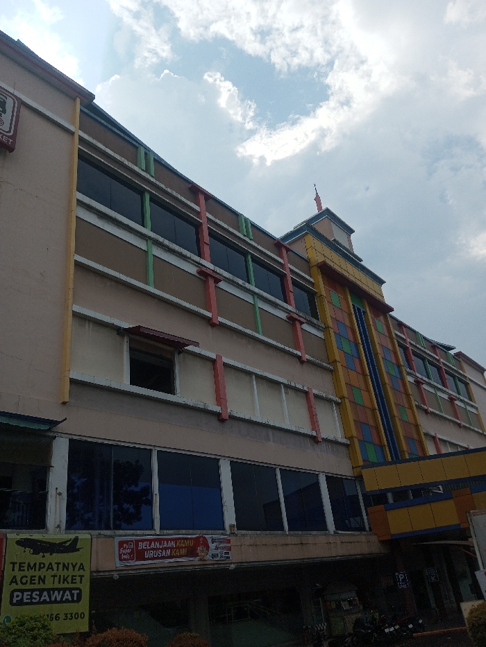 A low-angle shot shows a multi-story building with a blend of architectural styles. The building features beige walls accented with vertical stripes of red and green. Windows appear tinted, reflecting the sky. A section with a colorful, grid-like facade adds a modern touch. Visible signs include "TEMPATNYA AGEN TIKET PESAWAT." A tall structure tops the building's corner, resembling a miniature tower. The sky above is partly cloudy.