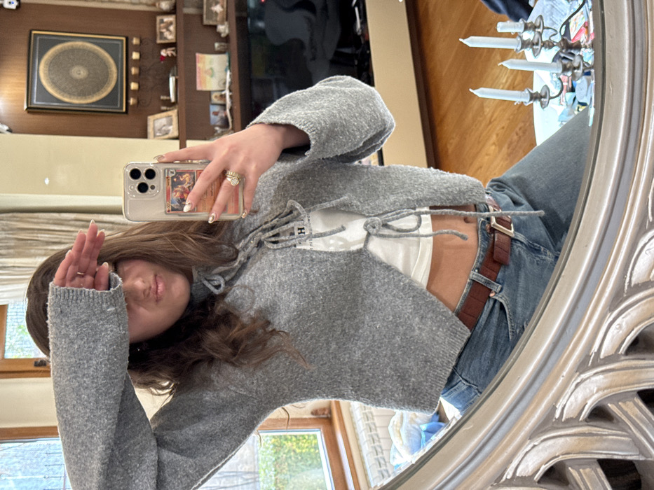 A young female is depicted indoors, taking a mirror selfie. She has long, dark brown hair and is wearing a light grey, fuzzy, cropped cardigan with multiple front ties, revealing a white crop top underneath. She wears light blue denim jeans with a brown leather belt and a gold buckle. Her left hand is raised, palm out, obscuring her forehead and eyes, while her lips are pursed in a slight pout. Her right hand holds a smartphone with a clear case containing a Charizard Pokémon trading card; a large ring is visible on her right ring finger. The ornate, silver-colored frame of the mirror is visible in the foreground. The reflected background reveals an interior room with a wooden floor. To the left, a window with a wooden sill and a white radiator shows a glimpse of bare trees outside. To the right, a wooden shelving unit displays various decorative objects, framed pictures, and a large, dark-framed piece of circular abstract art. A dark television screen is partially visible, along with a silver four-armed candelabra holding four unlit white candles. The scene takes place in an indoor setting in Sofia, Bulgaria.