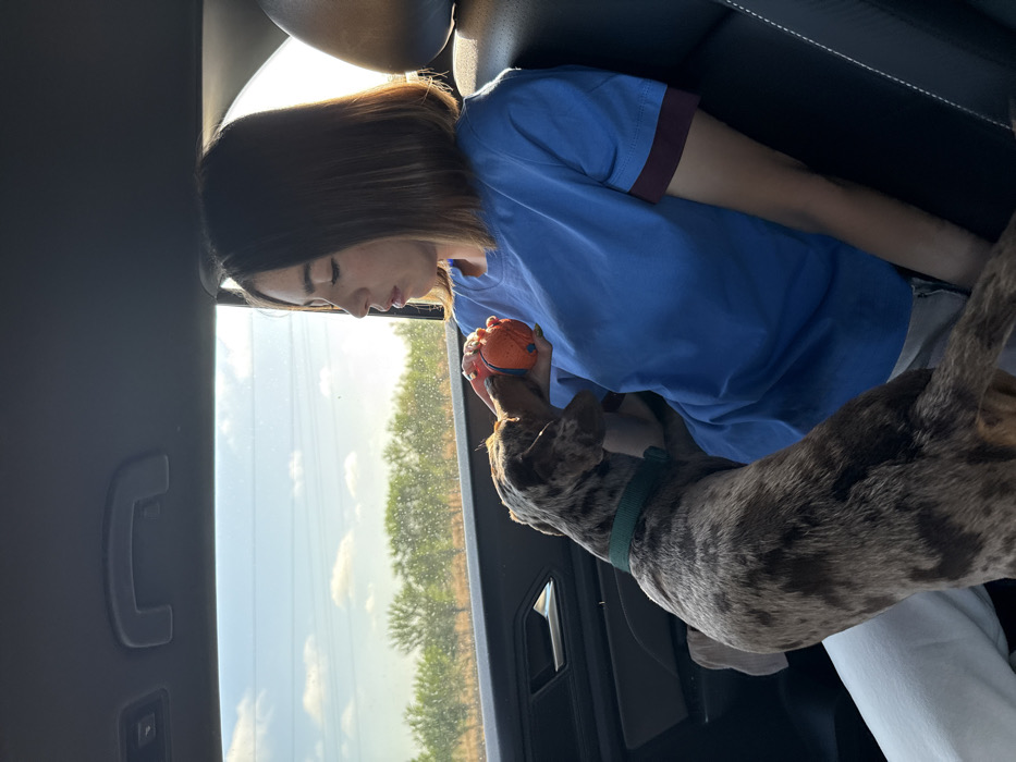 The scene is set inside the rear passenger compartment of a vehicle. A young adult female, with short, dark bob-style hair, is seated on the left, wearing a blue t-shirt with dark cuffs and light-colored pants. Her gaze is directed towards a small to medium-sized dog with a distinctive mottled or dapple-patterned coat in shades of brown, black, and tan, wearing a green collar. The dog is standing on its hind legs on the female's lap/legs, with its front paws and muzzle near an orange and blue spherical toy held by the female in her right hand. The interaction shows the dog intently focused on the toy. The vehicle's interior features dark-colored upholstery on the seats and door panels, with a silver door handle visible on the left. Through the vehicle's window, a clear blue sky with some scattered white clouds is visible. In the mid-ground, a row of green trees stretches horizontally, and drier, lighter-colored vegetation is present in the immediate foreground outside the window. The lighting suggests it is daytime, with sunlight illuminating the scene from the right side. The specific location within Pleasanton, United States, cannot be determined from the visual information provided in the image, as the outdoor environment is generic and lacks identifiable landmarks.