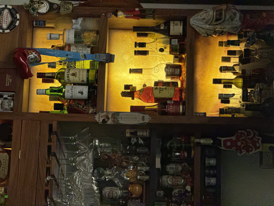A well-stocked, illuminated home bar features rows of various liquor bottles