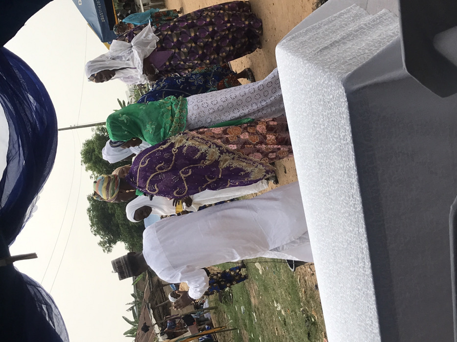 The image depicts an outdoor social gathering in Orudu-Olokan, Nigeria