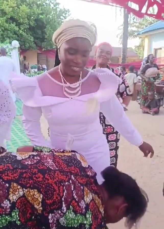 woman dressed in a white dress and headwrap standing at an outdoor event. People are handing her money and dancing around her, including one woman who is bent over in front of her. There is a pink and red decorated canopy above the scene. Other people are milling around in the background.