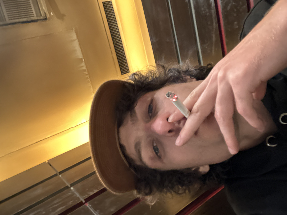 A young person with curly hair wears a tan hat and dark hoodie. They hold a lit cigarette to their lips, the glowing ember visible. The person's face is angled, showing a partial view of their blue eyes and nose. The background appears to be an interior space with a yellow-lit wall and possibly a window unit. The image is somewhat grainy, and the subject's hand obscures part of their face.