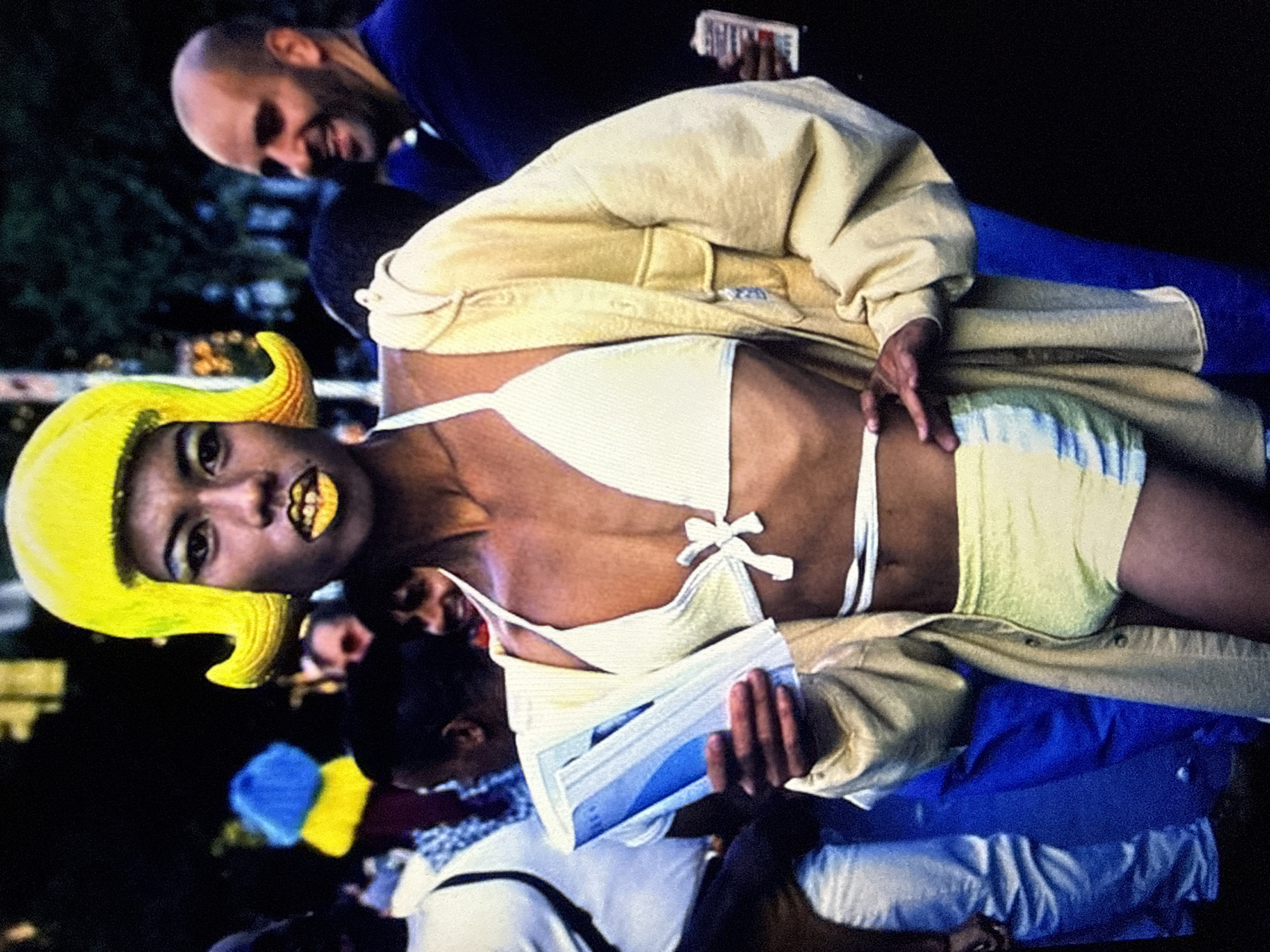A wide-angle, color photograph shows a woman in a yellow wig and bikini top, wearing an open yellow jacket and short pants