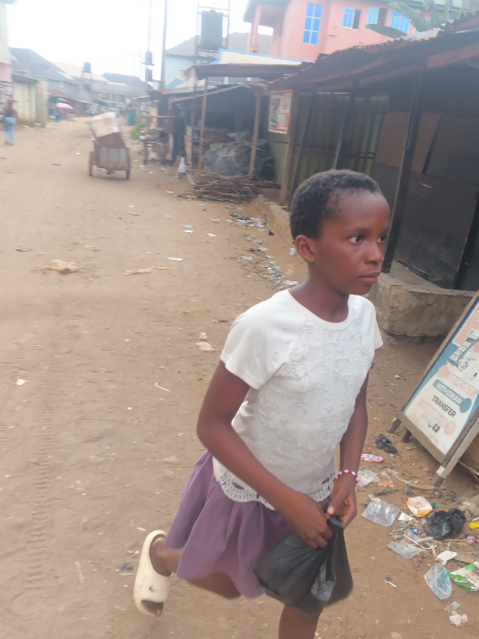 A young girl in a white shirt, purple skirt, and white sandal walks on a dirt road, carrying a black plastic bag. The setting appears to be a street in a less developed area. In the background, there are makeshift shops, a cart, and scattered trash. The girl is looking slightly off to the right, with a neutral expression. There is a sign that says "Withdraw Transfer" placed on the edge of a building.