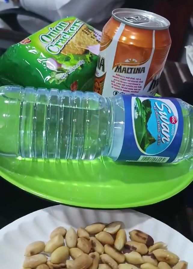 The video presents a close-up of a refreshment platter containing a bag of Onion Crackers, a can of Maltina, a bottle of Swan Natural Spring Water, and a plate of roasted peanuts