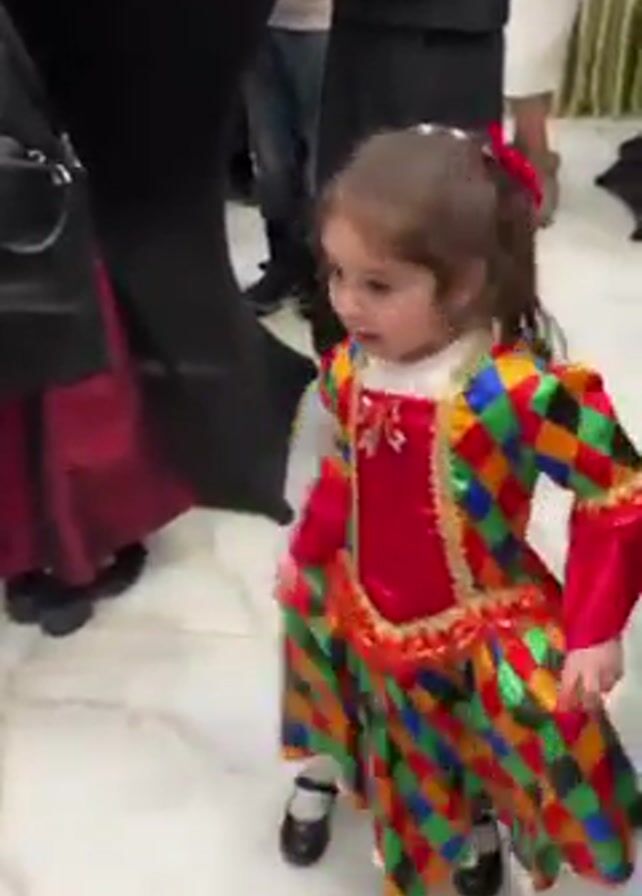 A little girl in a colorful harlequin-style dress with a red bodice and black Mary Jane shoes dances in a crowded room with a shiny tile floor