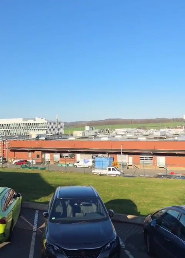 The video begins with a view from an elevated position, overlooking a parking lot with several cars. A lime green car is parked prominently in the foreground, along with a black SUV and a flatbed truck. In the background, there is a large, modern building with a distinctive pattern on its facade, along with other industrial buildings and a green field. The sky is clear and blue. The camera then pans slowly to the right, revealing more of the parking lot and the surrounding area. We see rows of parked cars, a grassy area, and a distant view of a town or village with houses scattered across the landscape. A dark brown Porsche and a red hatchback are also visible. The camera continues to pan, showing even more cars and the edge of the parking lot. The overall impression is of a sunny day at a busy facility.