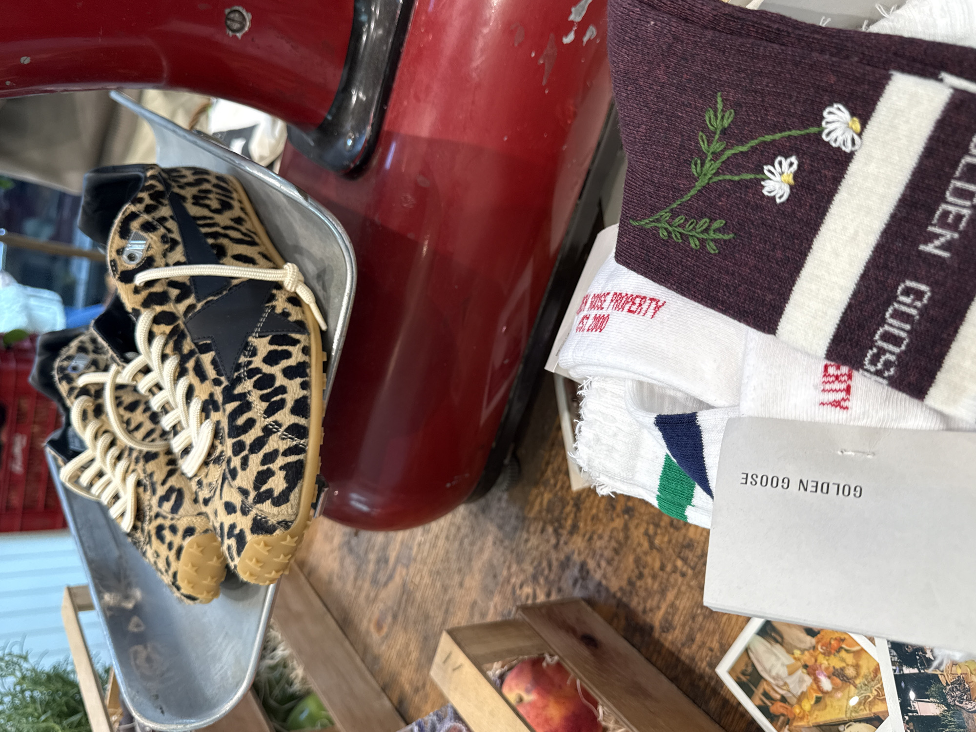 display of items on a wooden surface. There are shoes with a leopard print design in a metal container, next to a red item which appears to be part of a vehicle. A stack of socks, some with embroidery, and a "Golden Goose" tag are also visible. A wooden box with an apple is present. Based on the presence of the brand "Golden Goose," it is likely that this image was taken at a Golden Goose store in London.