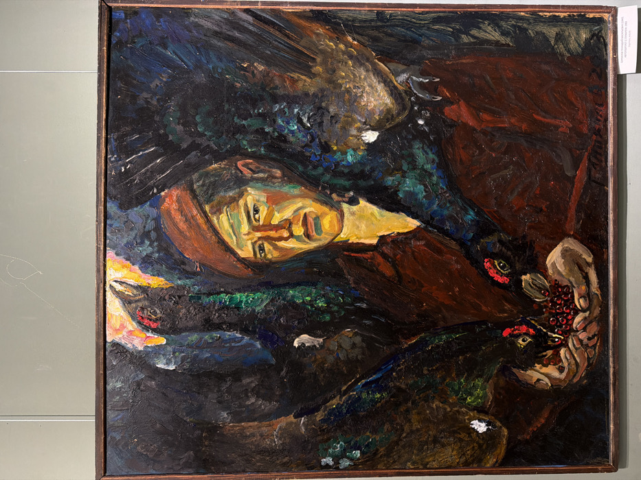 This image displays an oil painting titled "Hunter" (Охотник), created in the 1960s. The artwork features a central male figure, depicted from the chest up, with a pensive expression. He wears a reddish-brown beret and a dark reddish-brown jacket or shirt. His face is rendered with strong, angular brushstrokes in contrasting yellows, greens, and oranges. The man holds his cupped hands forward, filled with numerous small, bright red berries. He is surrounded by large, dark birds, resembling capercaillies or grouse, emerging from a dark, abstract background composed of deep blues, greens, and browns, indicative of a forest or nocturnal setting. Two prominent birds, with iridescent green and blue plumage and distinctive red markings above their eyes, have their heads lowered towards the man's hands, appearing to feed on the berries. A partial view of a third bird is visible on the far left, and another bird's wing and talons are seen on the right. The painting exhibits a bold, expressionistic style with thick impasto. The artwork is encased in a simple, dark brown wooden frame. It is displayed indoors, mounted on a plain, light grey wall. A small white informational label is present on the wall below the bottom right corner of the painting. This label identifies the location as the Irkutsk Regional Art Museum named after V.P. Sukachev, situated in Irkutsk, Russia. The label also confirms the medium as oil on canvas.