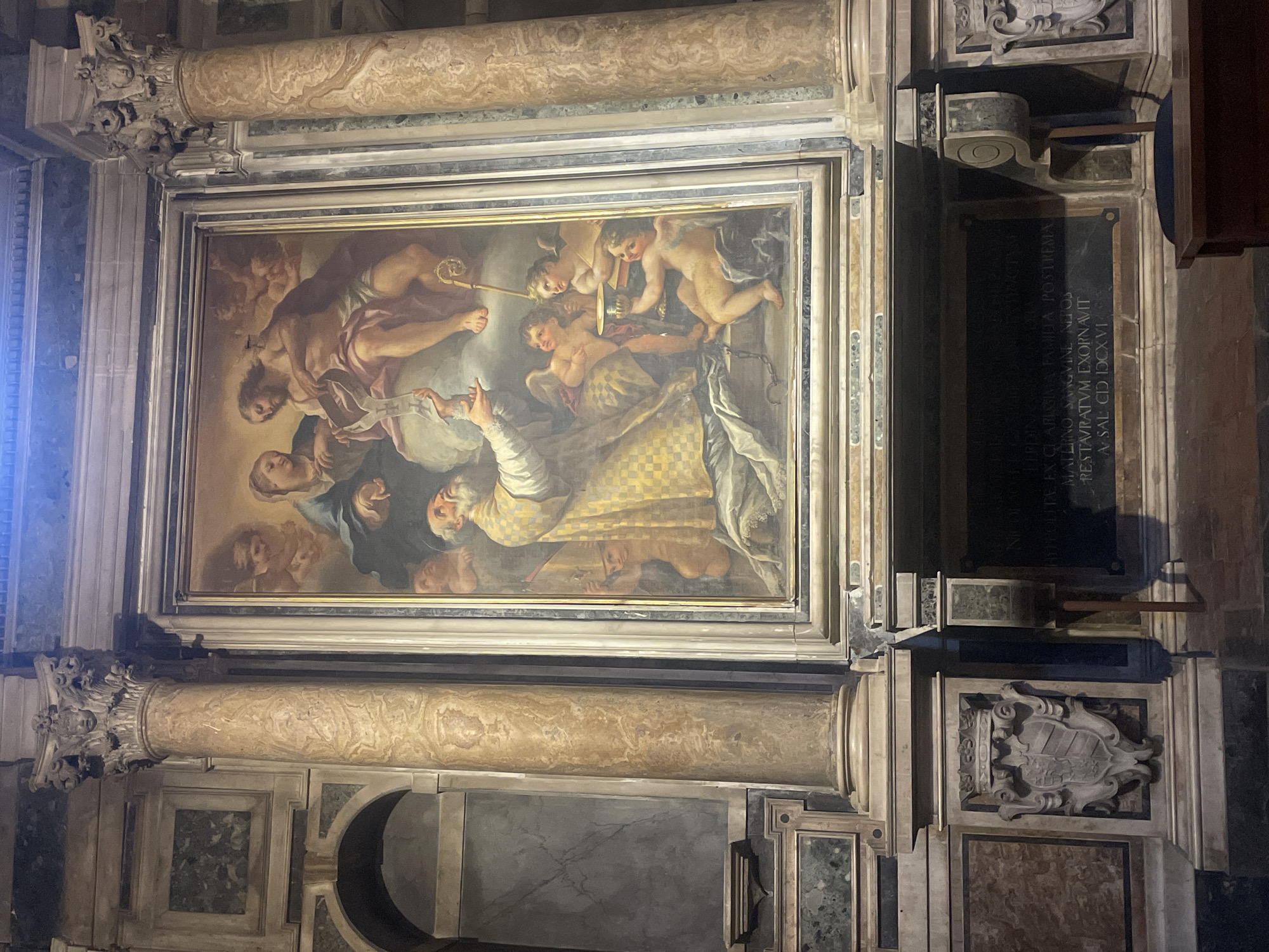 The image captures a painting in Naples, Italy. The artwork portrays a scene with several figures, including at least one older, bearded man in what appears to be ecclesiastical garments, surrounded by other individuals and cherubic figures. The painting is ornately framed within a marble architectural structure. To the right of the painting is a stone slab containing inscription text, and below it, a carved heraldic shield. The surrounding environment suggests the interior of a church or other religious structure.