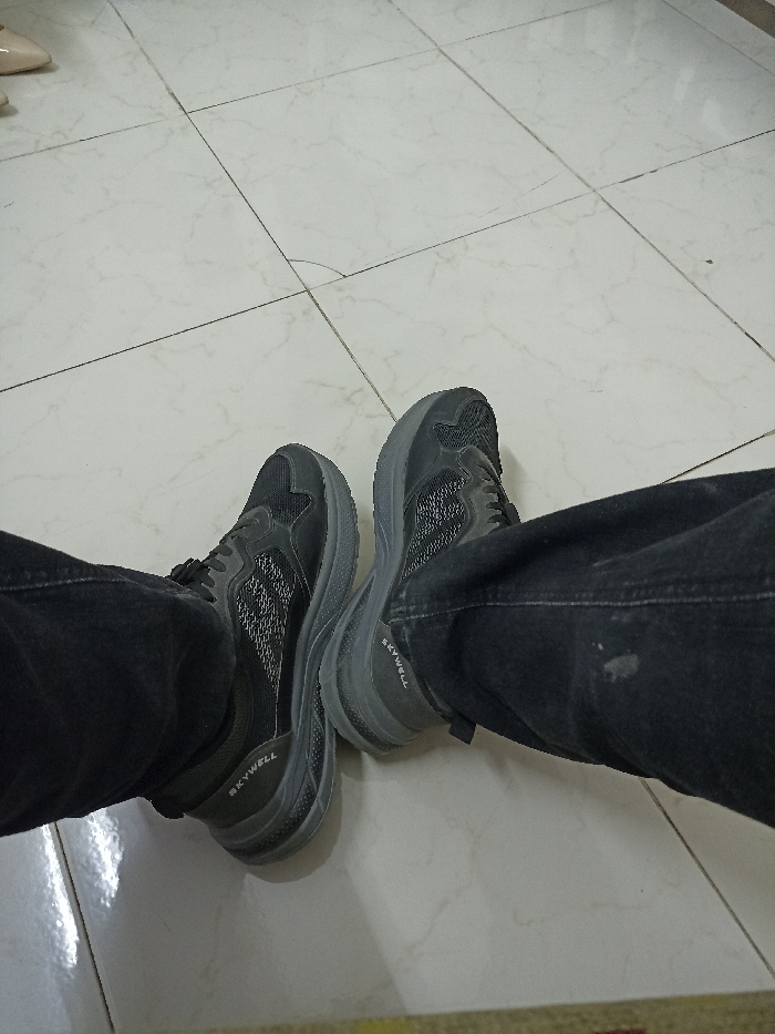 The image displays a first-person perspective view of a person's lower legs and feet, situated in Dahiyat Qudsaiya, Syria. The individual is wearing dark-colored denim jeans, with a faint light-colored scuff visible on the right pant leg. Both feet are shod in dark grey or black athletic shoes with mesh uppers, prominent laces, and thick, ridged soles. The brand name "SKYWELL" is imprinted in white lettering on the exterior heel section of each shoe. The feet are positioned on a light-colored tiled floor, characterized by rectangular or square tiles with dark grout lines. In the upper left background, the toes of a second pair of light-colored, possibly beige, high-heeled shoes are partially visible.