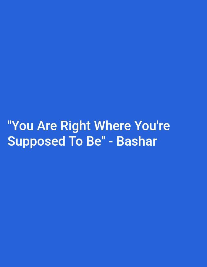 The image displays white text centered on a solid blue background. The text reads: ""You Are Right Where You're Supposed To Be" - Bashar". No other subjects, objects, people, actions, interactions, or environmental details are depicted. The image does not contain any discernible geographic features or context related to the city of Victoria, Canada.