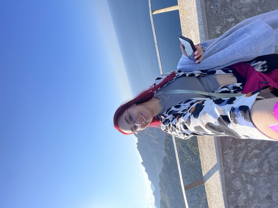 A young female individual is depicted in a selfie, smiling directly at the camera from a coastal viewpoint near Pollença, Spain