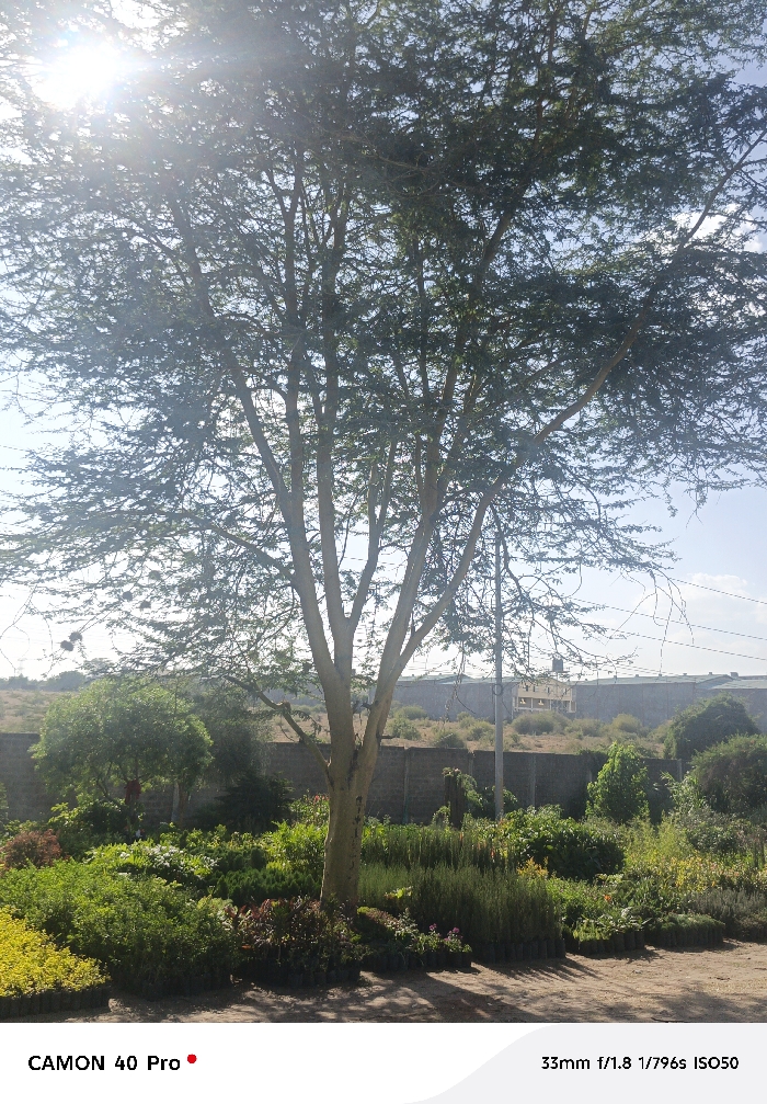 A sunlit image features a central, mature tree with a distinct light-colored trunk. The tree's branches reach towards the top, densely covered with small leaves. Below, a lush variety of green plants and shrubs are arranged in rows, seemingly in pots or containers. A concrete wall forms a backdrop, with glimpses of distant buildings and utility poles visible. The scene suggests a plant nursery or a landscaped garden with a strong focus on greenery.