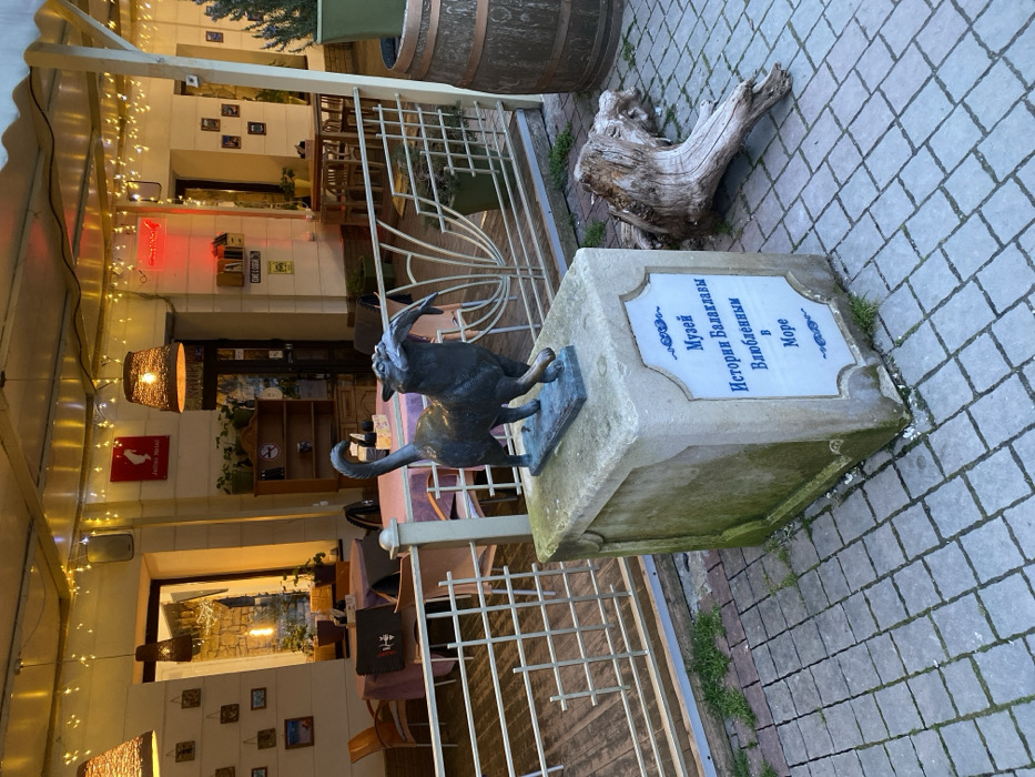 A black cat statue sits on a concrete pedestal with a sign in Cyrillic script. Behind the statue, a restaurant extends inward with tables, chairs, and warm lighting. A barrel and a piece of driftwood are visible to the statue's right. The scene is captured outdoors on a brick walkway. A metal fence separates the statue from the restaurant area.