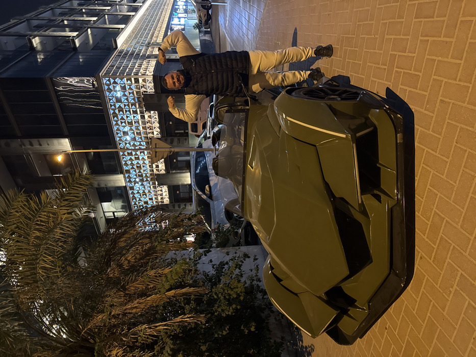 A man in a white sweater and black vest strikes a muscular pose atop a green sports car. He is on a brick sidewalk next to a palm tree and lush greenery. A modern building with illuminated, patterned accents stands in the background. Additional vehicles are parked nearby, adding to the urban setting.