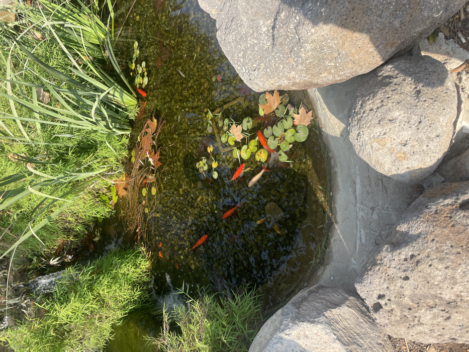This image depicts a man-made ornamental pond or water feature located in Tel Mond, Israel. The pond's water is clear, revealing a bottom composed of dark, small-grained gravel or stones. A narrow stream with a minor cascade enters the pond from the upper left, causing ripples on the water's surface. Approximately eight to ten goldfish (Carassius auratus) are visible swimming within the pond; most are bright orange or red, with at least one exhibiting a lighter, pale orange or white coloration. The pond's surface features multiple small, green lily pads concentrated in the lower right area, along with several scattered brown, dried maple-like leaves floating across the water. The immediate perimeter of the pond is lined with a light-grey concrete or mortared stone edge. Large, irregularly shaped, light-grey boulders with textured surfaces frame the lower portion of the pond. Dense green vegetation, consisting of tall grasses and other leafy plants, grows along the upper and left banks of the pond, some overhanging the water. Bright natural sunlight illuminates the scene, creating distinct shadows from the boulders and reflecting off the water. No individuals are present in the frame.