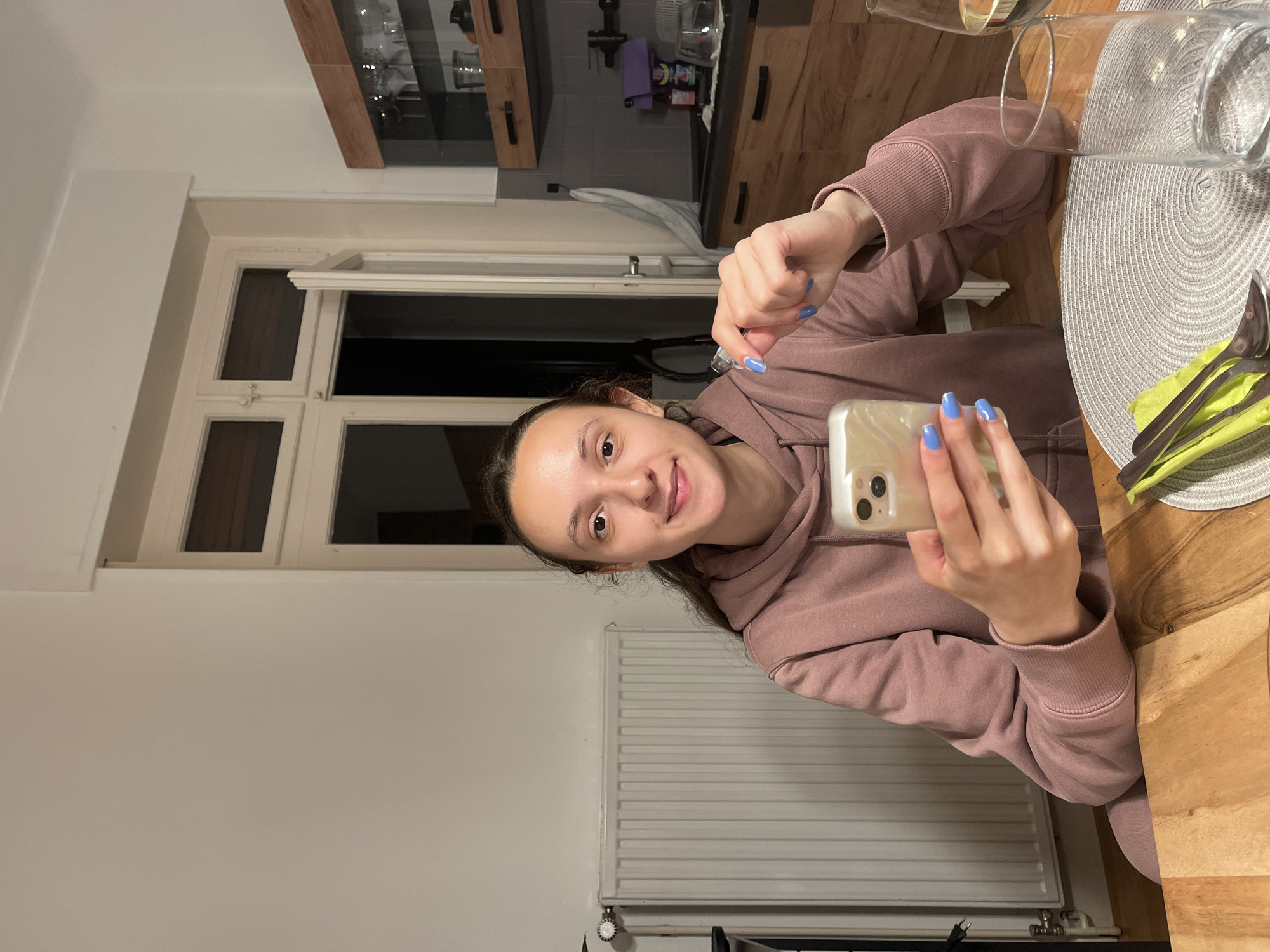 This image depicts an indoor scene, identified as being in Saarbrücken, Germany. A young adult female, with long brown hair, is seated at a wooden dining table, facing the camera directly with a slight smile. She is wearing a pink hooded sweatshirt. Her fingernails are painted light blue. In her right hand, she holds a light-colored smartphone with a three-lens camera array visible on the rear. Her left hand holds a small, clear, cylindrical object, resembling a glass vial or container. On the table in front of her, a grey circular woven placemat is present, holding a folded lime green napkin and a set of silver cutlery (a fork, spoon, and knife). Two clear drinking glasses are also on the table, one partially filled with a clear, yellowish liquid, likely white wine. The background to the left of the subject shows a white wall and a white, horizontally-finned radiator with a thermostatic valve. Behind and slightly to the right of the subject, a white-framed window is partially open, revealing darkness outside. To the far right, a kitchen area is visible, featuring wooden upper and lower cabinets, a grey tiled backsplash, and various kitchen items on the countertop. A white towel hangs on a hook on the wall, and a purple cloth is also present. A dark hose, possibly belonging to a vacuum cleaner, is visible near a doorway behind the subject's left shoulder. The scene is illuminated by artificial indoor lighting.