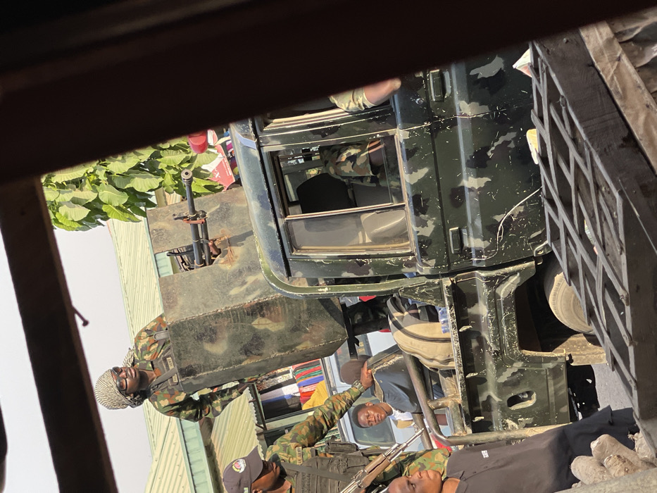 This daytime image, framed as if viewed through an opening, depicts a street scene in Samaru, Nigeria, featuring military personnel and a custom-fitted military vehicle