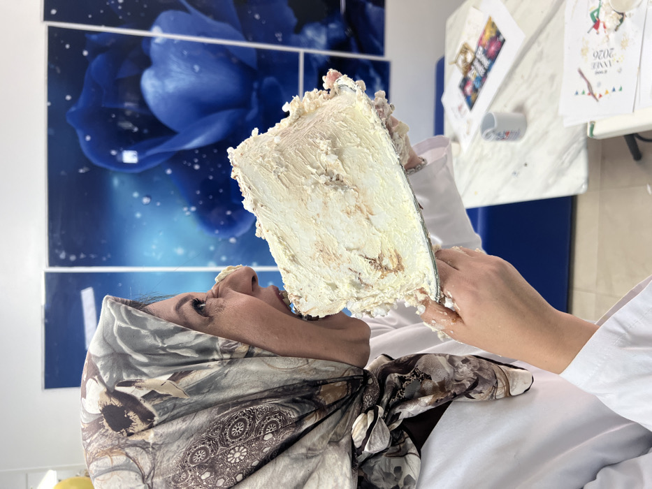 - "An adult female, wearing a white uniform and a patterned beige-brown headscarf, is depicted in profile consuming a large, heavily frosted cake directly from a silver cake board" by FM-ZQQC92, licensed under CC BY 4.0